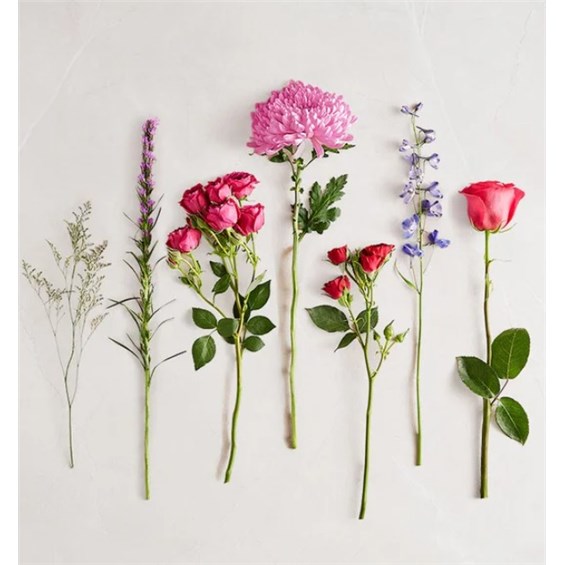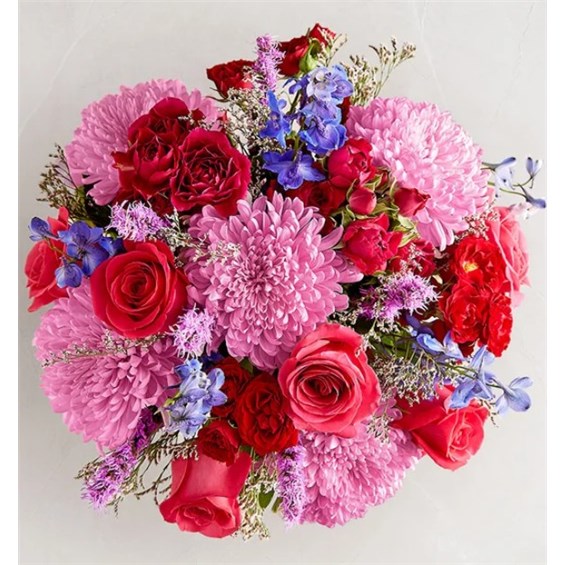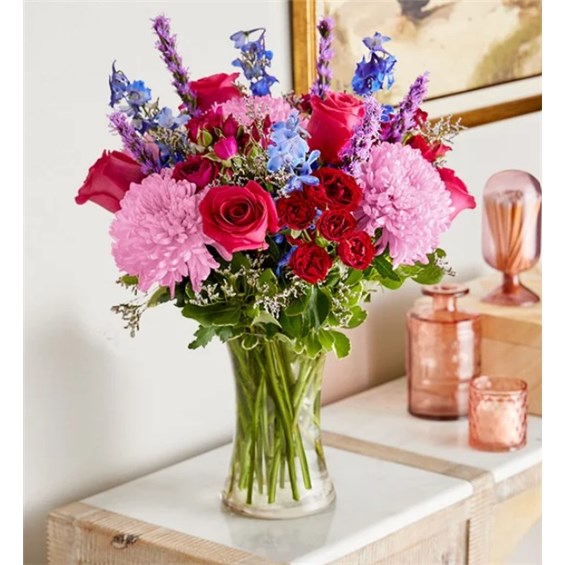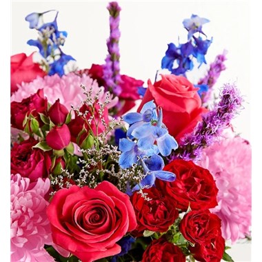 Color their world and brighten their mood with this medley of blooms and hues. Roses, delphiniums, and other flora in a rainbow of reds, pinks, blues, and violets make this bouquet a wonderful way to commemorate a milestone or transform an ordinary day into an extraordinary one.