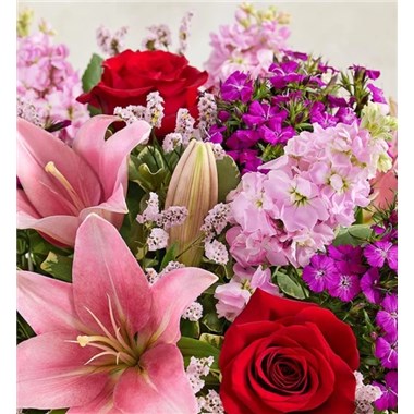 All-around arrangement with red roses, pink Asiatic lilies, Limonium and stock, purple dianthus; accented with assorted greenery