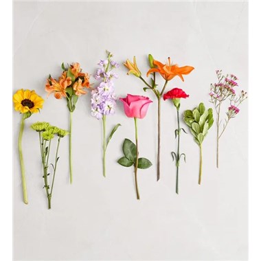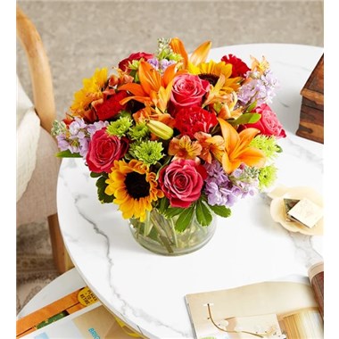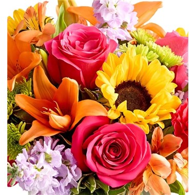 Like a warm embrace, our vibrant flower bouquet delivers your sentiments to someone special. A rich gathering of yellow and orange blooms, with pops of bright pink and purple, it's more than a gift… it's a way to express how you feel. Opt to have them delivered in kraft paper with a raffia bow or designed in a glass vase.